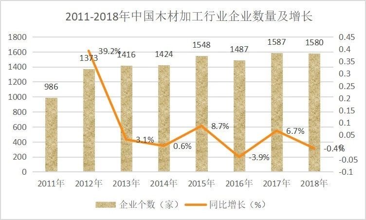 改革開(kāi)放以來(lái),經(jīng)過(guò)40年的發(fā)展,我國(guó)木材加工行業(yè)已經(jīng)取得長(zhǎng)足發(fā)展,2018年銷(xiāo)售規(guī)模已達(dá)1999.35億元,規(guī)模以上企業(yè)數(shù)量達(dá)1580家。在此背景下,鋸材、木片、人造板、木制品等細(xì)分市場(chǎng)也有顯著發(fā)展。